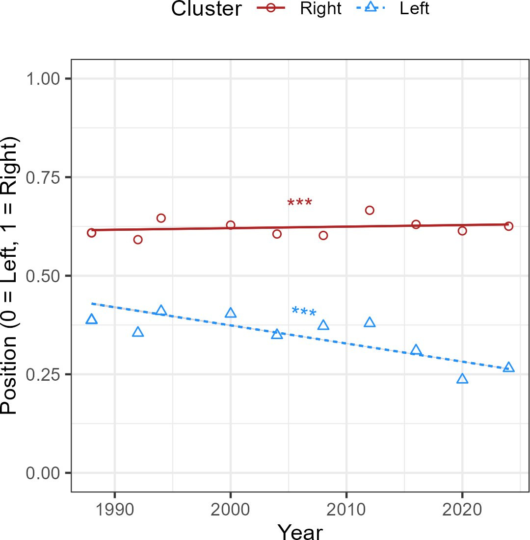 They then measured polarization along three dimensions: separation (distance between cluster centers), cohesion (internal agreement within each cluster), and size parity (whether the clusters are roughly equal, which intensifies political conflict). This led them to find a significant increase in “sorting”, the alignment of issues with partisan identification. By 2024, 20% more people in the Left cluster identified as Democrats and 51% more identified as liberals than in 1988; similarly, 30% more people on the Right identified as Republicans and 39% more as conservatives. The scientists point out that cross-cutting views have become much rarer, meaning there are far fewer “real” centrists who hold Left positions on some issues and Right on others.