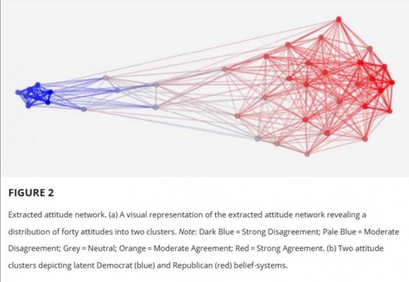 A fascinating study from 2024 supports this theory, and corroborates the Cambridge study’s findings on sorting as well. It found something many of us sense intuitively: that individual attitudes on hot-button issues form two structurally distinct networks that map cleanly onto partisan identity (i.e., knowing someone's position on one issue (say, gun control) lets you predict their position on seemingly unrelated issues (say, climate change)). It’s the shape of those clusters that jumps out:
