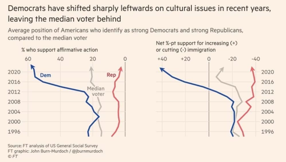 There are a few interesting theories as to why this happened. One comes from Ezra Klein’s former co-founder at Vox, Matthew Yglesias, who coined “The Great Awokening” in 2019. Yglesias argues that white liberals underwent a rapid, top-down shift on racial attitudes starting around 2012, driven not by their own voters but by elite signaling and social media dynamics—a shift that moved the Democratic Party’s cultural center of gravity faster than its base could follow.